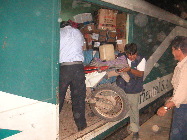 人口2千人、国境までのジャングルでは最大の村サンホセデチキートの駅で1時間待ったが無事にバイクと対面する。ブラジルの国境までは強盗が出たりする危険地域だから注意するように言われていたが、貨車の廻りはマシンガンで武装した兵士達に固められて立ち入り禁止になっていたところを見ると、貨車から荷物を強奪したりトラックを襲撃する武装グループは本当に居るのだろう。