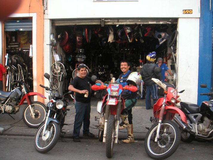 サンパウロに着くと、市の中心にあるオートバイ街へと向かった。旅を始める前にバイクの整備などをして頂いたバイク屋さんRJR MOTOSに挨拶に行くためだ。社長のフビーニョ(Rubinho)はイナダさんのレース時代からの親友で、彼自身もイナダさんの引退後にチャンピオンを取った男だ。友の友は友という南米の素敵な考えのお陰で僕は面倒を見てもらっていた。言わば旅のスポンサーだ。