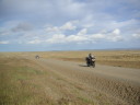 雨が小降りになるまで暫くコーヒーを飲み、心身ともに温かくなって再びフィルと共に雨の中へ走り出した。アスファルトの上では排気量で勝るフィルはあっという間に見えなくなるけれども、チリに入国し未舗装路になれば僕の世界。今度はフィルを後ろに見て、写真を撮ったりして彼を待ちつつ一緒にマゼラン海峡を目指した。往きに通った257号線よりも1本西側のこの道は車も殆ど通らず、昔自転車旅行をしたことのあるニュージーランドやアイスランドの田舎道に似ている。雨もすっかりあがった牧場の中に柔らかく淡い光が差し込む風景は、寒々とした中にも温もりを感じる幻想的なものだった。