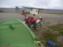 往きと同じフェリーでマゼラン海峡を渡った夜10時過ぎに日没を迎えた。彼は何処かの村で宿を探すと言う。彼はパタゴニアバイク旅行者としては珍しくテントを持っていないのだ。もちろん何処の町にも宿はあるからそういう旅のスタイルもありだ。僕は数日前に泊ったマゼラン海峡の目の前の灯台か何処かのガソリンスタンドにでもテントを張ろうと思っていた。この日は遅くまで走ったし体も冷え切っていたから宿に泊るという選択もあったけれど、長年の旅の経験がこの時はテント泊に軍配をあげさせた。フィルと明日会う約束をして別れ、僕は田舎の小さなガソリンスタンドの草むらにテントを張らせてもらった。