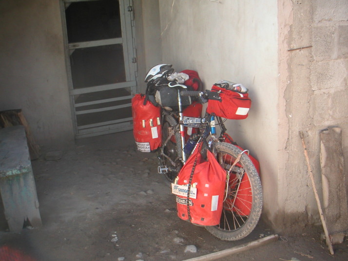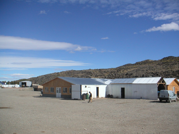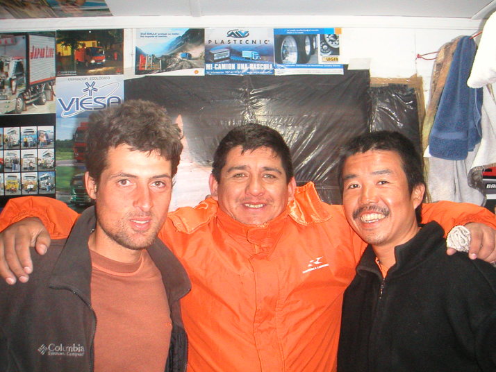 チャイテンを離れて40号に戻り北上する道は未だ舗装されていない。交通量もいよいよ無くなり、荒涼としたうねる原野を遠くの山の陰まで道が伸びている。その山の向こうに行ってもまた同じような道が永遠に続く。今日はどの町にも着けそうにない。キャンプ場で出会った北から南下していたファルク達ドイツ人が、これから北に上がる僕に情報を教えてくれた。“1日走った距離の辺りに道路工事の労働者達の基地があるからそこに泊めてもらえるし暖かい食事もご馳走してくれる”と。なるほど丁度その日を終えようかとテント場を探しはじめた時に道路工事区間がはじまり、やがて聞いていた宿舎が見えた。そしてそこで向こうからやってきた自転車の青年に出会った。お互い立ち止まり“今晩どうする?”と形ばかりの相談をしたが、お互いに最初から同じ事を考えていた。2人で工事事務所に泊めてもらうお願いをしに行った。聞いていた通り快く中に通され、工事人用の2段ベッドが2つ置いてある小さなタコ部屋に泊めていただけることになった。食堂で食事を配給してもらう如何にも労働者らしい風情の50人くらいの人達の列の最後に申し訳なさそうに2人で並ぶが、彼らも料理人も僕達に気を留める様子もなく自然に受け入れてくれる。部屋に1人住むホルヘはとても親切ないい奴で僕らを喜んでもてなしてくれた。遠く北のメンドーサ地方から単身赴任で出稼ぎに来ているという。寒さと風がしのげて温かい食事まで出る環境に僕らは楽園を見ていたけれども、家族と離れてこんな所で長いこと過ごす彼らは寂しく退屈に違いない。