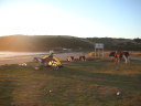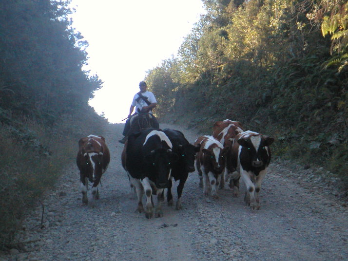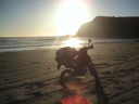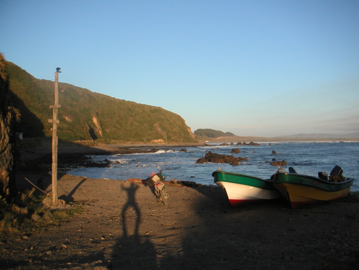 朝方遠くで人が小さく咳払いする様な音が聞こえた。テントの中で耳を澄ましているとゆっくりと忍び足で近づいて来る気配があった。ドイツ人ライダーからテントを襲われた話は聞いていたし、ホテルで盗難に遭ったばかりだから五感は張り巡らせていた。音をたてないようにナイフを準備して待った。いよいよテントのフライを外から触ってきた。もう一度今度は強く下から上へ触ってきた時に彼の手の動きに合わせて内側からそれを押し返してみた。このまま襲われたら不利だけど、こちらから不意打ちを食わせれば少しは有利に展開できるかもしれないとの咄嗟の判断だった。すると慌ててテントから逃げていくちょっと重めの足音が聞こえた。意外と臆病な強盗だなあと拍子抜けしてテントから顔を出して見ると牛が背を向けてこちらを見ていた。人の手だと思っていたのは牛の舌でフライの夜露を舐めたあとがついていた。何十頭の牛が海岸を移動している最中だった。こんな牛の“襲撃”を1週間後にもまた味わった。