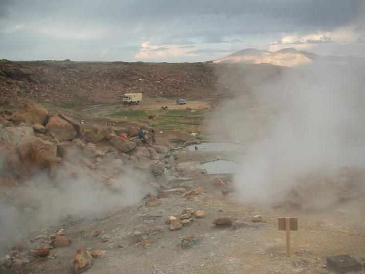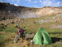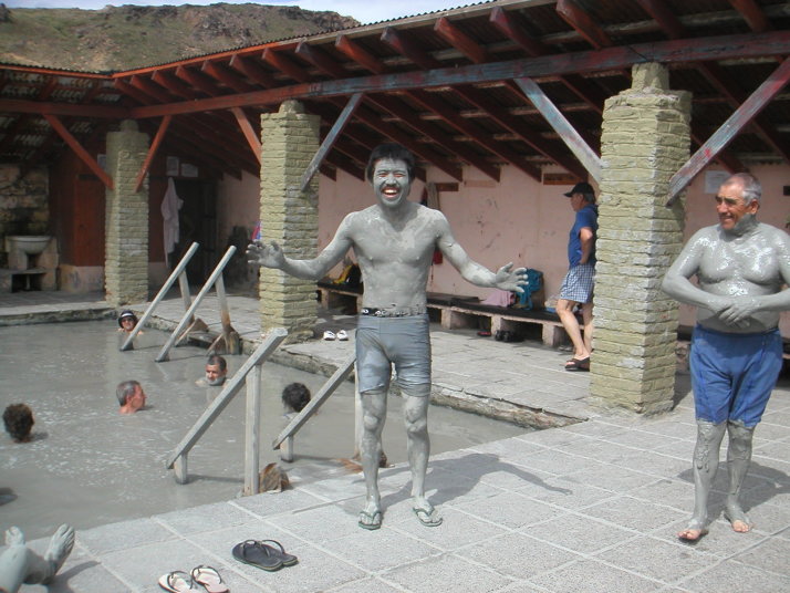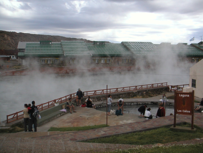 Copahueは密かな湯治保養地だ。泥湯や色んな種類の温泉に入れる大きな温泉施設のまわりに数十件の家が並ぶ程度の素朴な村だ。曇った天気と停電で村全体に色が少ない。温泉施設には医者やカウンセラーなどが居て、まるで病院のような雰囲気もある。先ず看護婦の問診を受け、健康状態や滞在日数などを申告するとお勧めの温泉を紹介してくれ、滞在中の入浴プログラムも提案してもらえる。料金は僕の場合泥湯温泉と緑色の温泉に入って、問診も含めてたったの10ペソ(350円)くらいだった。それぞれの温泉には係員がいて泥を縫ってくれたり名前を呼んで入浴時間の管理もしている。湯船の足元からはブクブクと泡が出ていて時々熱湯が出てきたり冷たかったりすることもあるが異国の温泉の雰囲気満点だ。村の外れにある無人の温泉の横で2晩キャンプをした。辺り一面から湯気が出ていて大きな岩の間には天然のサウナもある。テントの直ぐ横でもプクプクと湯が沸いている。標高は2000m近くて山には雪も残り夜はかなり冷え込むけれどテントの中は天然床暖房が効いていて少し暑いくらいだった。