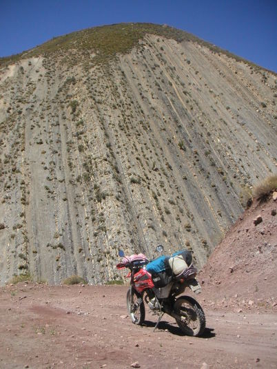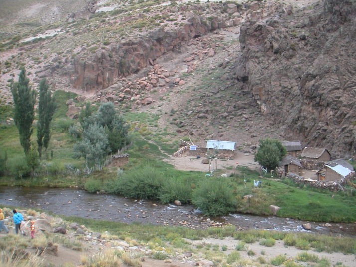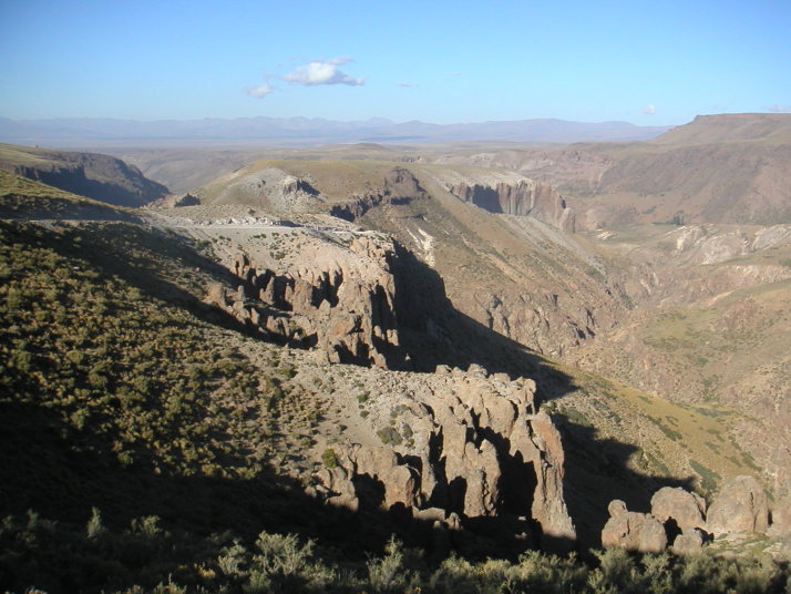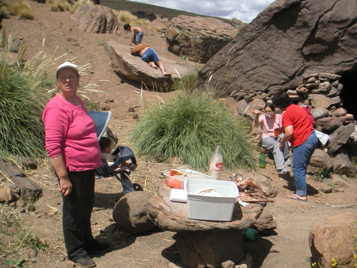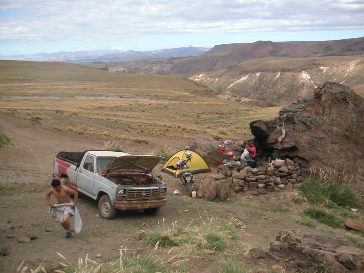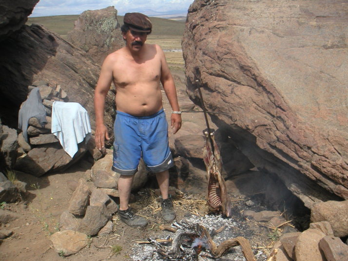 昼ごろ出発準備をしているとボロボロの古いアメリカ製トラックがやってきた。運転席の2人だけかと思ったら荷台の幌の中から子供から爺さん婆さんまで家族がぞろぞろと出てくる。陽気な人達で、近くの村から日帰りの家族旅行に来たのだと言う。おもむろに子豚の塊肉を取り出し、足をロープで縛って近くの大きな岩からぶら下げて干す。これからこれをアサードにして食べるからお前も一緒に食べていけと言われて甘えることにする。ビールをもらい、焚き火のスモークで豚を燻製にし、思いがけぬアサードパーティーを楽しませてもらった。午後になり僕が出発を告げると、おばあさんが残った肉や大きなパンの塊を僕の荷物に詰め込んでくれた。出会った時からお別れまでいつも自然でさりげなく、あまり人の事を気にしないように見える南米人。それなのにやっぱりどこかで見知らぬ旅人を気遣ってくれる。この微妙な距離感と優しさは南米ならではのもので、とても清々しく心地よい。