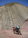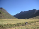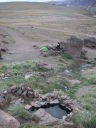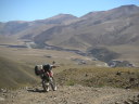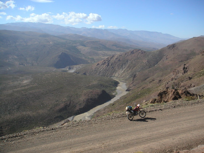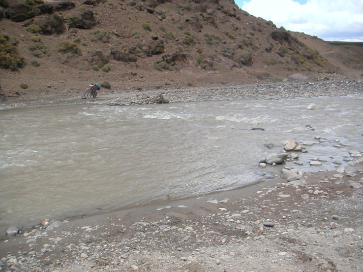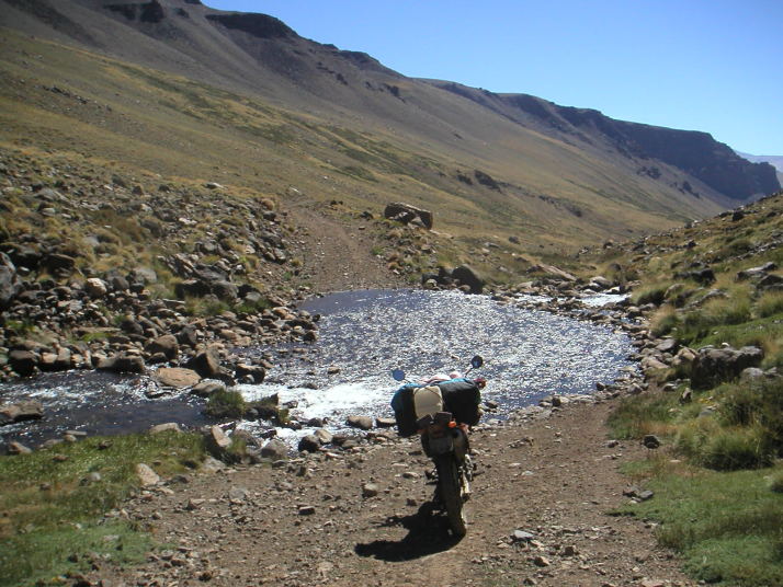 道はいよいよ荒れて遂に川に阻まれた。川の向こうにも弱々しく道のような跡が続いているが最近通った形跡は無い。バイクを降りて歩いて渡ってみた。水は冷たく予想以上に流れはきつく、川底は大きな石がゴロゴロ、踏ん張って歩くのが精一杯だ。パンツまで濡れた。キャブレターぎりぎりの高さまで水に漬かる。ここが日本の勝手知った山で、捨てても良いバイクだったら挑戦したかもしれないけれど、地球の果てのような所でやるにはリスクが大きすぎた。