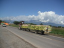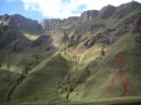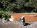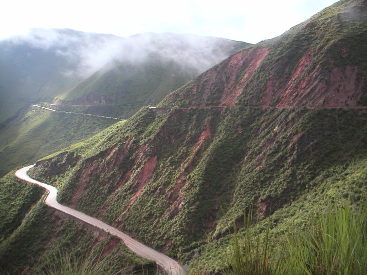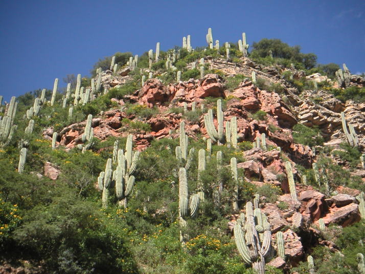 峠から東の谷を見下ろすと絶景が広がっている。垂直に見える崖に道路がへばりつくようにジグザグと谷まで下っているのが見える。下から上ってくるトラックが真上から見下ろすように見える。山から湧き出してくる大きな沢を何度も渡りながら下っていく。山と川そして密生するサボテンのコントラストが美しい。