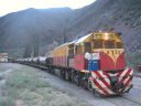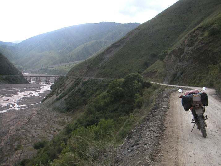 サルタでバイクの用事が済んだのは夕方6時を廻っていたけれど、静かな所で泊りたかったので街を離れ51号線でチリ方面へ向かう事にした。直ぐに舗装路は終わりまたしても川を見下ろす崖に張り付くガードレールも無い道路を進む。途中何度も線路と交差する。この路線は珍しく今も現役で使われている。鉱石を運ぶ貨物列車と日曜日だけ観光列車も1本走っている。