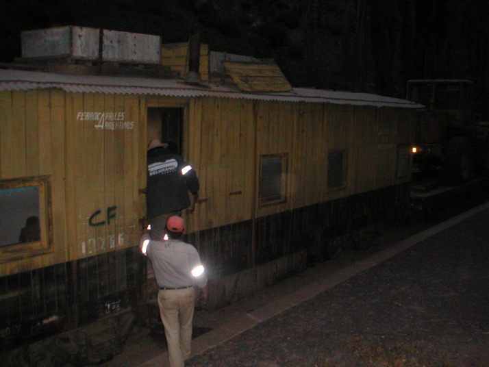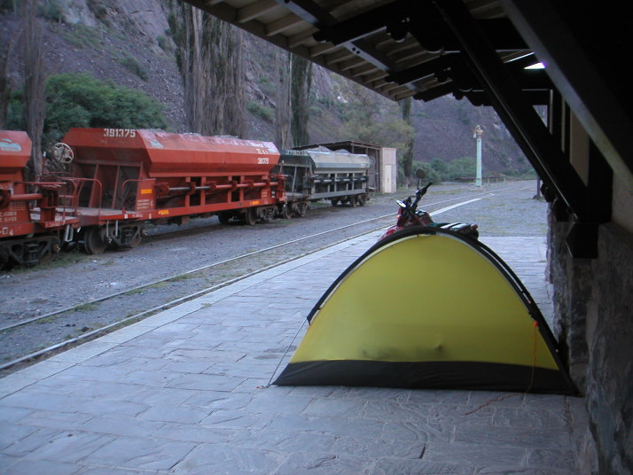 もう日没が迫っていたので、近くの列車の駅に泊れるか聞いてみる事にした。駅には貨物列車が停車中で、近くの線路上で作業員が動き回っている。彼等は土砂に埋まったレールを掘り起こす作業をしていた。最近の雨続きで岩山が崩れやすくなっているようだった。それを想定しているのか、或いは鉱石の積み下ろしの為かは分からないが、列車は狭くて暗い人夫の家になっている貨車4両とブルドーザーを載せた貨車も引いていた。作業が終わり列車が行ってしまうと住み込みの駅員2人と僕だけが取り残された。彼等は喜んで駅を使わせてくれた。駅舎の中に泊っても良いと言われたけれど、電気も無い駅舎の部屋は暗くて寂しいのでホームにテントを張らせてもらった。彼等はフフイ州(Jujuy)というアルゼンチンで最も貧しい州の一つから単身赴任している人達だった。東西を高い山に囲まれた狭い谷は日の出が遅く、早く沈んでしまう。標高は既に2000mあるので日が沈むと冷え込む。列車は1日1本あるか無いかなので列車が去ってしまうと冷たい静寂が訪れる。近くに家が1軒あるだけで夜になると車も全く通らなくなる。駅舎にあるラジオと電話が唯一音を発生させるもので彼らの娯楽だ。電気が無いから時々手動発電装置を回す音が石作りの駅舎にこだまする。故郷の家族に電話しているのか真っ暗闇の部屋からくぐもった話し声が聞こえてくる。僕は人生に多くの事を望みすぎているのだなと感じる。ふと今のままの自分、今のままの環境に満足を感じる。何も無い世界に星だけが一際輝いて見えた。