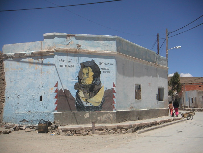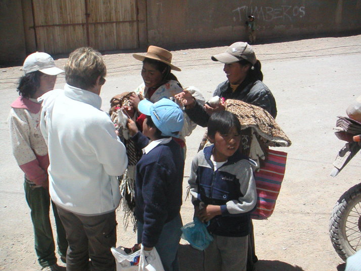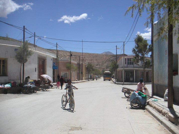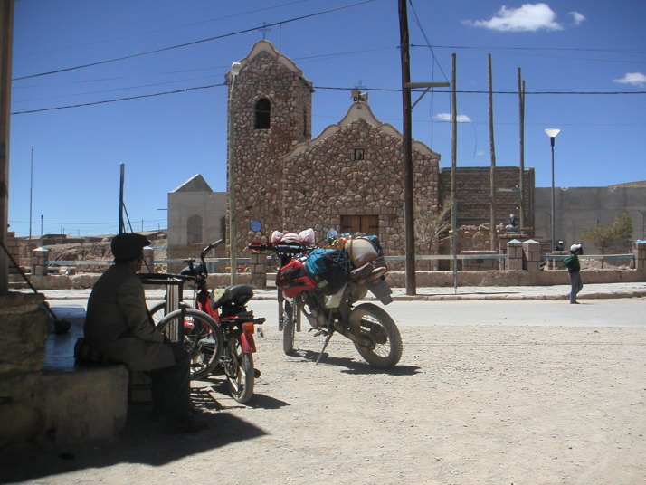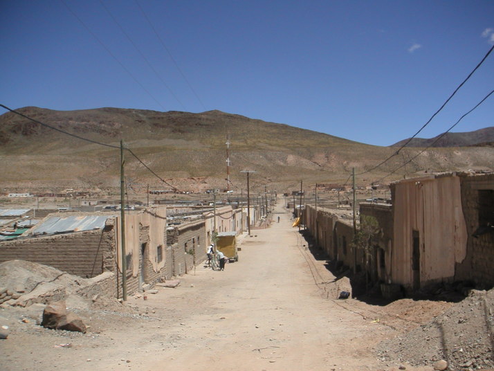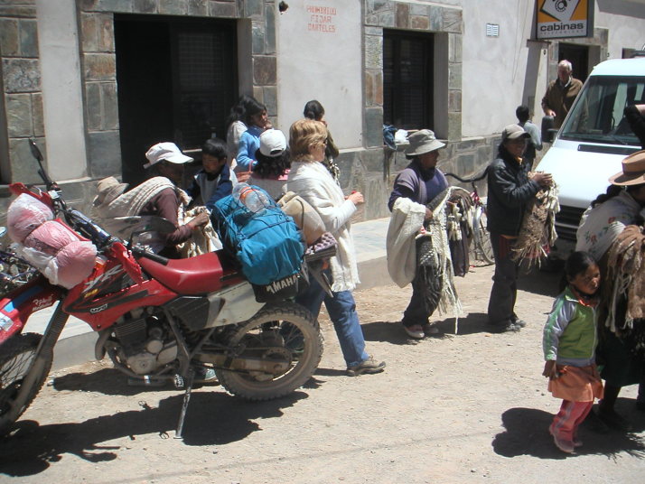 そこは先住民の貧しい街だった。街の名前コブレス(銅)の通りかつては銅鉱山で栄えたのだろうが今は何も無いように見える。街の中には案の定独特の背負子に子供を背負った同じ様な物売りのおばさん達が居た。子供を背負っているくらいだから未だ若いのだろうが、毎日強い太陽を浴びた顔は皺だらけで笑顔に覗く前歯はまばらだから年齢が想像できない。外人観光客が入りそうなレストランの前に彼女達がたむろしていたから直ぐにそこがレストランだと分かった。峠で見たフランス人の白いバンも止まっていた。昼時のレストランにバンが1台しかいないのだから、この街に来る観光客の数は高が知れている。僕も昼食を摂ろうとバイクを止めると直ぐに集まってきたが、荷物の隙間が無いことを示すと直ぐに諦めてくれた。というのも丁度その時フランス人達がレストランから出てきたからだ。僕の様なヨレヨレのバイクの格好をした人よりも、金回りが良さそうな清潔な格好をした年寄りのフランス人旅行者の方がチャンスがあるのは誰にでも分かる。フランス人達はたちまち囲まれていた。