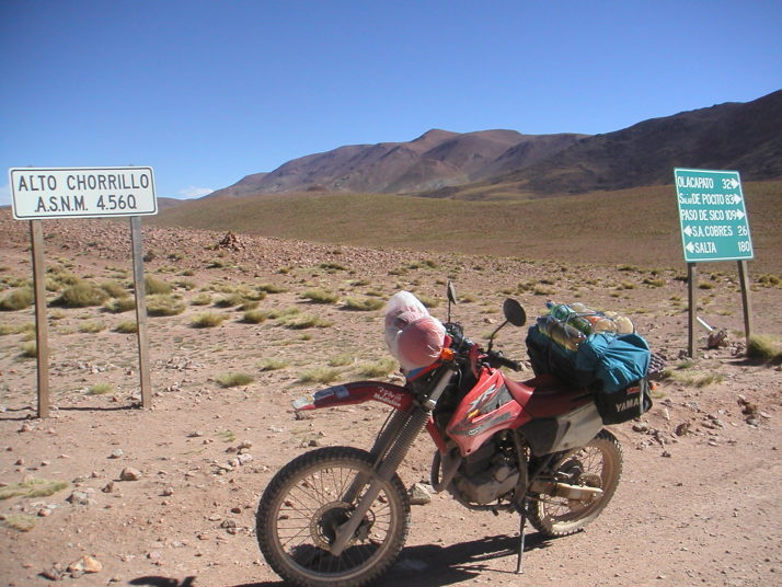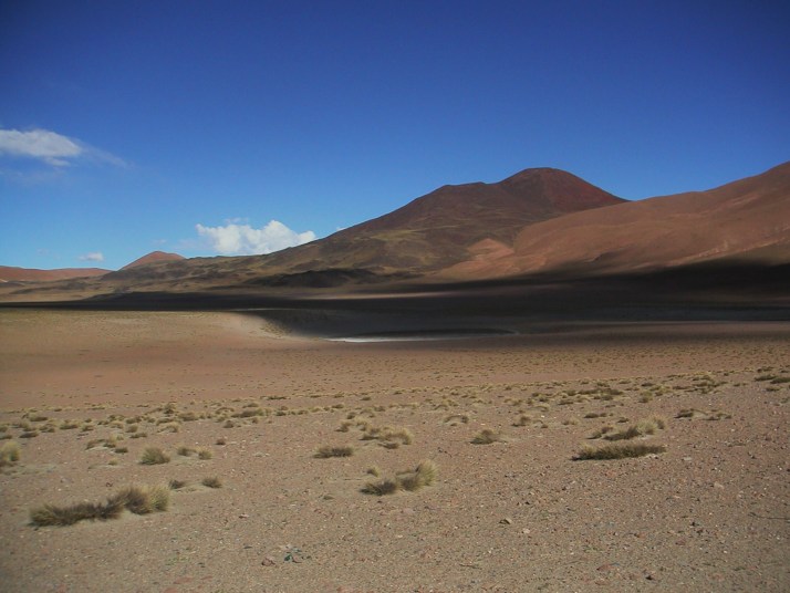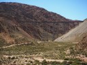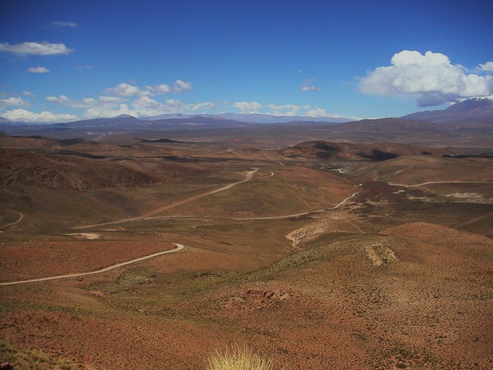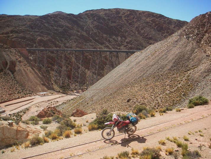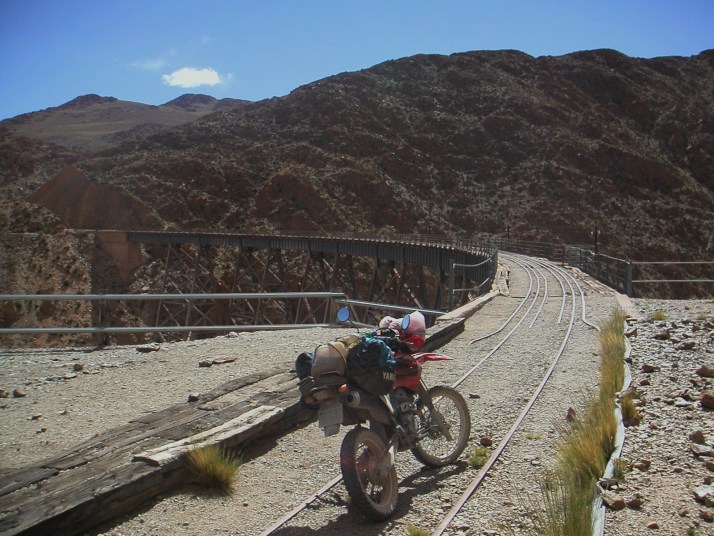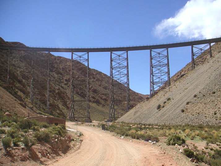 コブレスの近くに地上64mの鉄道のボルボリジャ鉄橋(Polvorilla)がある。サルタからの観光列車の目玉であり終着点だ。列車は標高1187mのサルタから、数々の鉄橋、トンネル、ループ、スイッチバックを経て標高4220mのここにたどり着く。コブレスの観光案内所で行き方を聞くと、それはチリ方面へ向かう道を途中を右に折れて20分くらいで着くと教えてくれた。しかし行けども行けどもそれらしき枝道が見付からない。途中何度か右に曲がる道に入ってみたが、行き止まりだったり元の道に戻ってしまったりだった。久々に出会った対向車を止めて聞くと大分行き過ぎているという。その測量工事の人が曲がる場所まで先導してくれた。そこは見覚えのある場所だったが何の標識も無く、道も頼りなく、コブレスを出て間もない場所だった。有名な観光地のはずだから看板があるだろうし、そこそこ広いしっかりした道だろうと勝手に想像していたのだが、こんな所を車やバイクで訪ねる人など殆ど居ないのだろう。案の定鉄橋までの20分、朽ち果てた鉱山があっただけで何も無い乾いた土地が広がっていた。鉄橋の手前で線路にあがりゴトゴトと枕木の上を走って鉄橋の上に出た。下には土産物屋が2軒あるが客は誰もいなかった。きっと日曜日に観光列車が来る時以外は殆ど誰も来ないだろう。