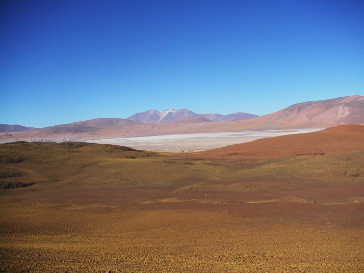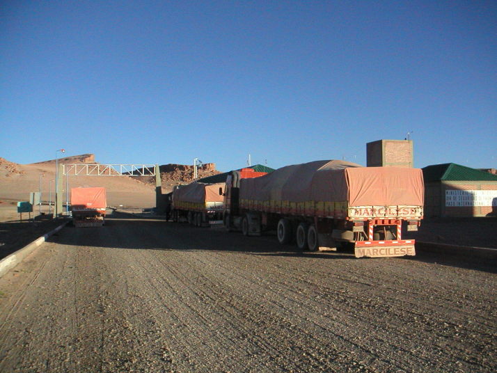 チリ側の国境事務所も夢のように美しい景色の中にある。フラミンゴが群れる塩湖の畔の白い結晶を舐めてみたら本当に塩だった。気の遠くなる昔に海底が隆起して4000mまで上がってきた証だ。本当にそんな事が地球に起きているなんて驚きだ。先行していたトレーラー3台がゲートの前に止まっているのが見える。幾ら綺麗に見えてもチリの国境は今までの経験からすると係員の対応がアルゼンチンに比べて事務的で、時には横柄で、時間がかかる事が多く、食物検査もあるので身構えてしまう。まあ、公務員というものは多少の差こそあれ万国共通の雰囲気がある。