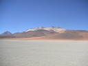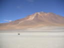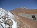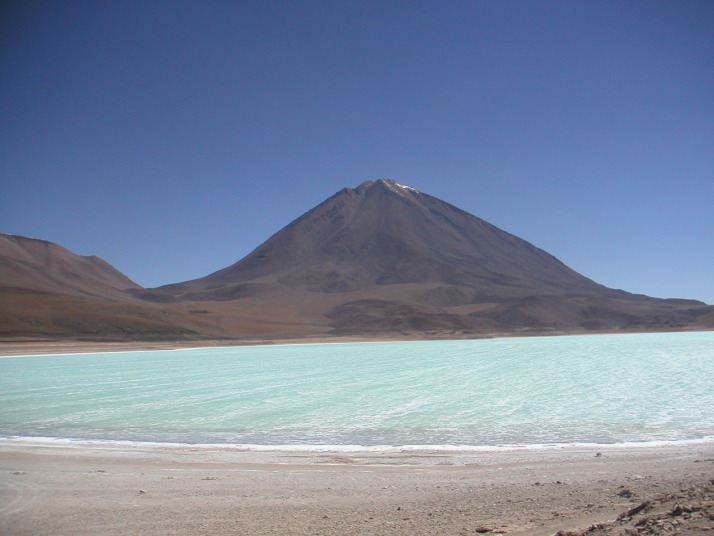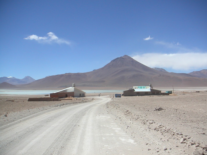 アルゼンチンへ引き返すように27号線をJama峠方面に登ってゆき左に富士山のような形をしたLicancabur火山(5916m)を見たところで左折する。標高2400mのサンペドロデアタカマから道路脇に雪が残る5000m近くまで上がってきたので途中再びエアクリーナーを外さなければならなかった。左折した途端に舗装が無い酷い悪路になって直ぐにボリビア国境が現れる。しかしここは無人だったので更に車の轍をたどって進むと綺麗な湖の畔に今度こそ本当の国境事務所がある。“バイクでよく来たな。”と言って国境係官に握手で迎え入れられた。イメージしていたボリビア人の対応と違ったので肩透かしを食らった。入国税15ボリビアーノとアバロア自然保護区の入場料30ボリビアーノを払った。この一帯は保護区に指定されているが、標高5000m前後の土地なのでどのみち人は殆ど住んでいないし、たまに見かけるツアー客のランドクルーザーくらいしか車は居なかった。