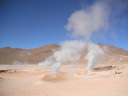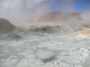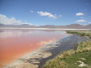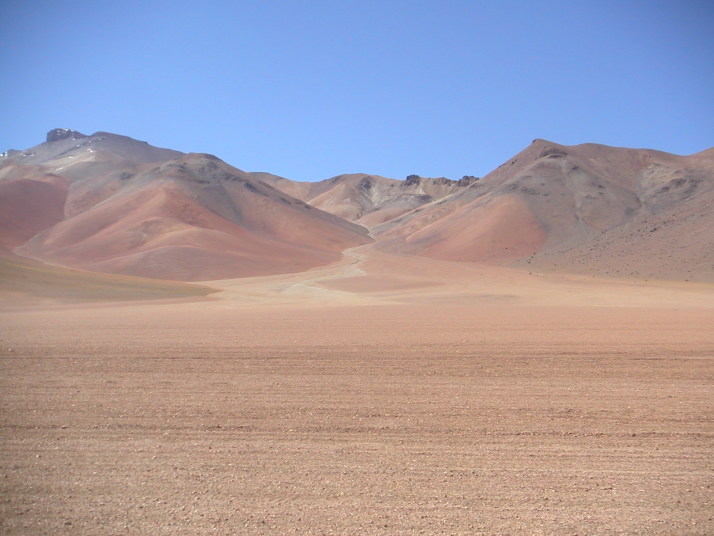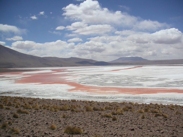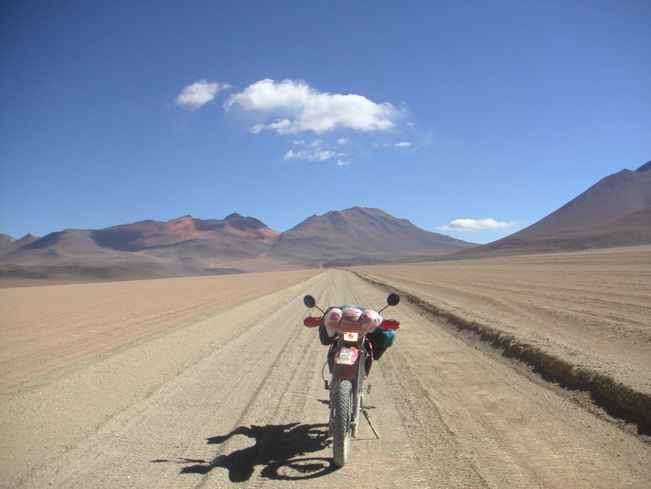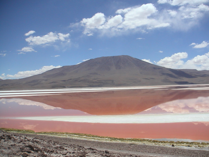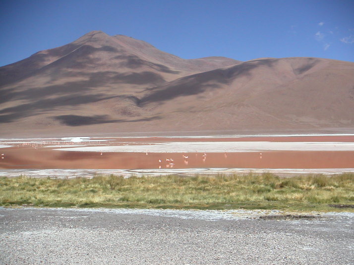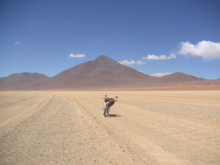 山を背にした絵のようなLaguna verde湖、悪魔の炊事場のようなドロドロとした間欠泉、遠くの山に何となく消えていく道らしき跡、赤い湖にフラミンゴが群れるLaguna Colorada湖。どの瞬間、どのアングルを捉えても期待を裏切らない夢のように美しい世界でカメラが手放せない。しかしファインダーの区切られた景色は実物の美しさを台無しにしてしまいそうだから脳裏にしっかり焼き付けようと何度も立ち止まった。走っている時もごろごろしている尖った石でパンクしない様に気を配り、砂利でハンドルが取られるのを堪えたりしながらも全ての景色を見ようと横や後ろにも首を回らした。