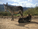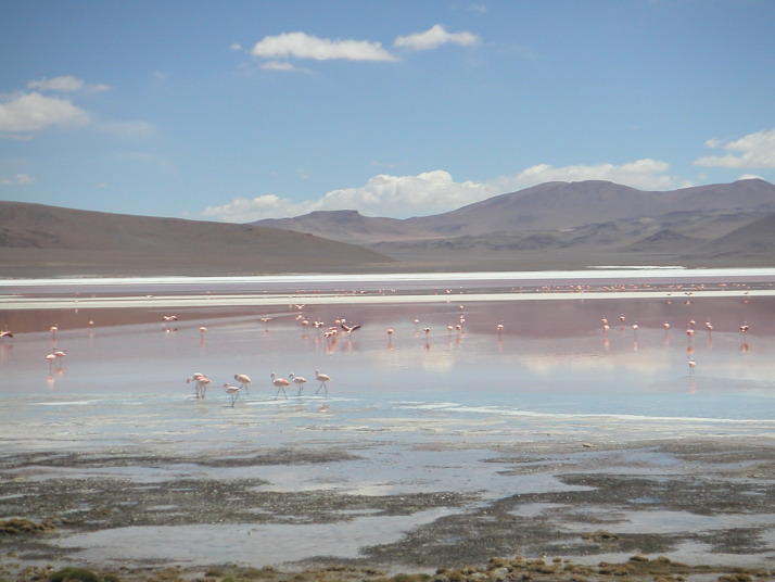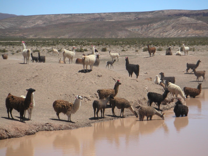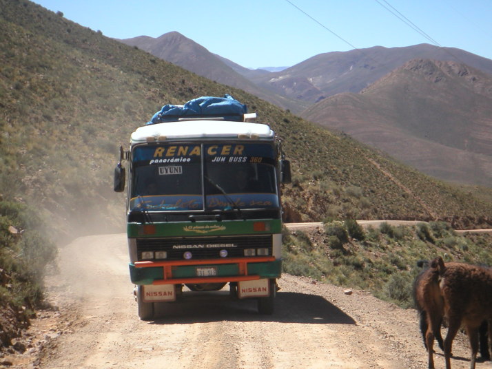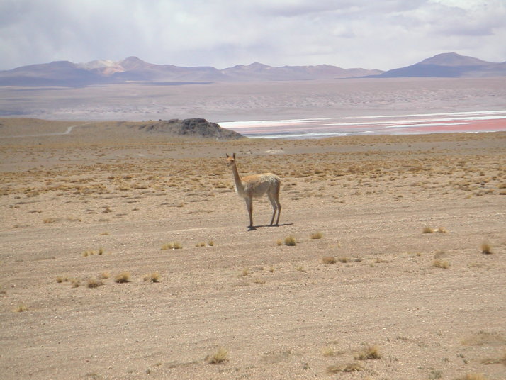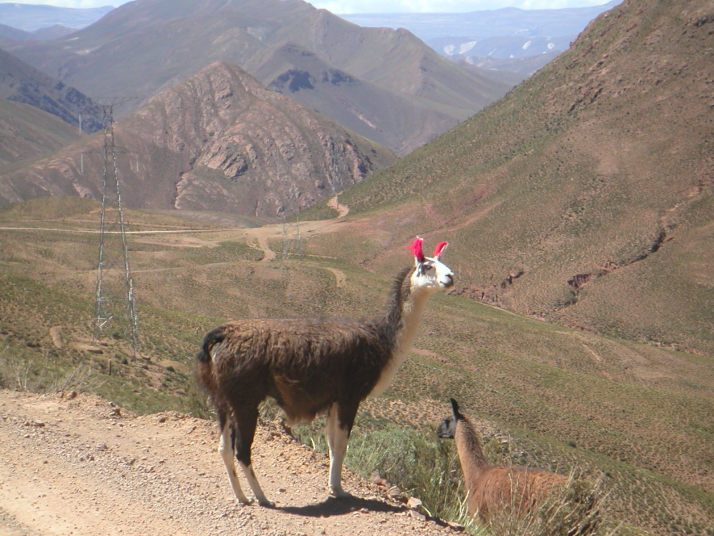 酷い腹痛で目が覚めた。昨晩食べたリャマがあたったのだろうか。この辺りは牛は見かけずリャマという首が長くて顔はラクダの様なとぼけた顔をしている動物を道端で見かけることが多い。リャマは至近距離に近づくまで逃げないから、“リャマに注意”という道路標識も飾りではない。耳には可愛いリボンをしているが、これはお洒落をしているのではなくて飼い主の識別の為だろう。毛や皮はセーターや皮細工などに使われ、街の露店や土産物屋へ行くと色とりどりの色彩に男の僕でも物欲をそそられて見入ってしまう。ボリビアの物価は南米の中でも特別に安いので欲しいものを欲しいだけ買えるけれど、僕のバッグには余計なものを入れる隙間は全く無かったからいつも指を加えて見ているだけだ。唯一鹿肉の様に少し臭みがあって美味い肉だけは胃袋の隙間に詰めることが出来た。この日、ウユニから208km東のポトシという都市へ移動しているときもたくさん見かけた。他にもアンデスにはビクーニャ、アルパカ、グアナコなどリャマに似た動物、ヤギ、ロバ、羊、豚、水牛などの家畜が柵に囲われているでもなく勝手にその辺で高山の乏しい草を食んでいる。中には野生の物もいるだろう。