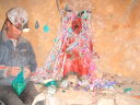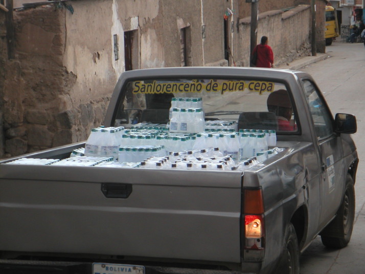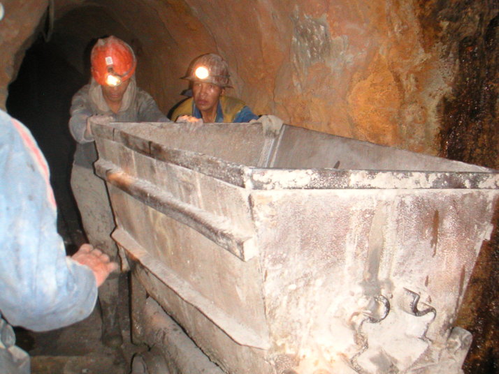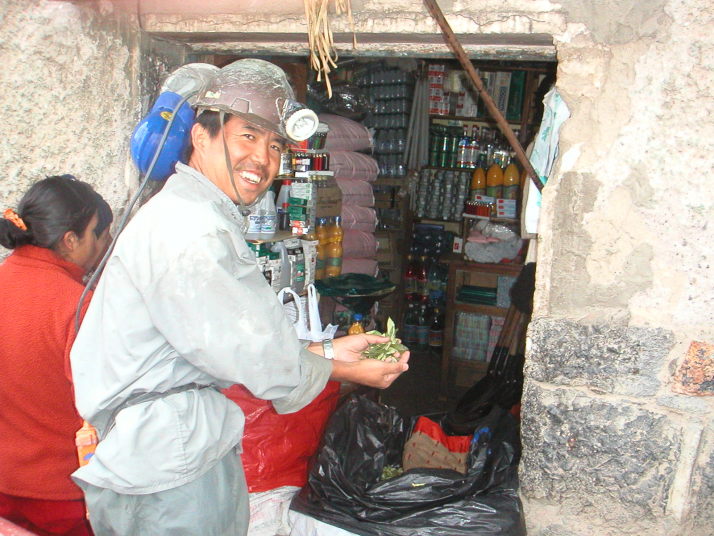若いスウェーデン人5人と南アフリカ人カップルと一緒に乗り込んだ車は30年前のニッサンキャラバン。セルモーターは弱々しく、エンジンをかける為に男たちは何度も車を押さなければならなかった。鉱山に入る前にまず鉱夫に配る土産を買いにキヨスクに寄る。仕事をしているところを観光でお邪魔するわけで、ツアー客は一人10ボリビアーノ(140円)のお土産を持参するのが慣例になっている。持って行くものはペットボトルの怪しい色付きジュース、粗悪なメモ用紙で巻いたような紙たばこ、サトウキビから作ったアルコール96%の酒、コカインの原料ともなるコカの葉の袋詰めとコカの効能を引き出す石灰の塊、そしてダイナマイトだ。ダイナマイトを除けば、これらを1種類ずつ全部買っても10ボリビアーノで足りてしまう。酒は業務用アルコールと呼ぶべき代物で火を付けたら燃え続ける。これを水やジュースに混ぜて飲むらしい。コカは殆どの国で麻薬として所持すら禁止されているけれどボリビアでは合法でコカ茶としても普及している。ボリビアでは時々片方のほっぺたを膨らませている人を見かける。鉱夫や農作業をする労働者に多い。はじめて見た時はほっぺたが腫れる何かの病気かと思っていたけれど、実は彼らはコカの葉を口に入れている。噛み続け1日平均40g消費するという。劣悪な環境で長く苦しい労働に耐えるためにはコカの覚醒作用や強いアルコールが不可欠なのだと元鉱夫だったガイドのおじさんが教えてくれた。ダイナマイトは効率よく掘り進めるのに有効だけれど、値段が高いので頻繁には使えないのだそうだ。ツアーと言ってもハリウッドのツアーの様に見学者の通路があるわけでも何でも無かった。作業着に着替えて鉱夫と同じ様に歩いて狭い坑道に入る。いきなり2人の鉱夫が鉱石を満載したトロッコを押して坑道から出てきた。レールはガタガタだし所々レールが埋まっていたりするからなかなか前には進めない。彼らを引き止めてガイドは僕らに説明をすると彼らにプレゼントを二つ三つ渡した。そうして人に会う毎にプレゼントを渡しながら坑道を奥へ奥へと進んでいった。中には分岐が幾つもあり、体一つ通れる垂直の穴にかかった梯子を上り続けるとレールの敷いていない別のとても狭い坑道に出る。山の中はアリの巣のように何層にもなっているのだ。上の坑道の鉱石は専用の穴を使ってトロッコのある下の坑道に落とす仕組みになっている。この掘削最前線では30代の男と見習いの若い男がいた。顔は煤け表情は無い。朝から晩まで昼ご飯も無くこの狭くて暗い酸素の薄い空間で危険な重労働をしているのだから当然だろう。遠くで小さな手筒花火のようなダイナマイトが炸裂する。そろそろ来ると知らされていても凄まじい音と衝撃波に耳がやられ体がビクッとする。この山では落盤事故で年間10人から20人が亡くなり、それ以上の人がアルコールなどの影響で集中力を欠いて穴から落ちたりして命を落とすと言う。それでもここが唯一の産業。家系の中の誰かは必ず山で働いて、子供達は休みになると大人達を手伝って仕事を覚え、30代で塵肺で働けなくなる親に代わって鉱夫になるという循環を繰り返す。塵肺になった男たちは標高4200mのこの町で暮らすことはできず、酸素の多い低い標高の町に移り住むのだ。こんなに過酷な環境で働いていても彼らの稼ぎは僅かなものだ。町には20社程度の会社があり、彼らはそれぞれの会社の山で働かせてもらう。と言っても彼らはサラリーマンではない。基本給無しの完全歩合制だ。たくさん採掘しても含まれる銀の量が少なく質が悪ければ収入は少ない。ダイナマイトや掘削の道具は自前で用意しなければならないからマイナスになることもあるが、良い鉱脈に当たれば月に2000ドル(21万円)稼げる時もあると言う。命をすり減らしてたったのそれだけだ。