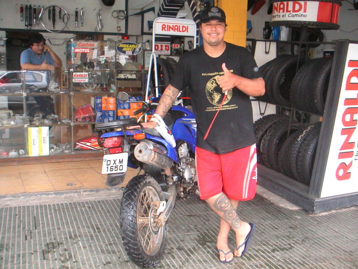 この日移動するのは諦めて再びホテルへ戻る途中に、朝寄ったバイク用品屋にこの旅ようやく2台目となるヤマハの旅行者のバイクが停めてあるのを見た。しかも仕事でつい最近まで頭を悩まされてきた発売されたばかりのXTZ250というブラジル製のモデル。気になって見に行くとブラジルヤマハの事務所があるサンパウロのグアリューロス市のナンバープレートが付いていて更に驚いて店に居た持ち主のブラジル人に話しかけた。彼は2台でペルーのマチュピチュへ向かう旅の途中、僕がこれから向かおうとしているブラジル方面の道で洪水にはまり、1週間泥と格闘しても前に進めず、最後にはクラッチを焼ききって進めなくなり、列車に載せてここへたどり着いてクラッチを買いに来たところだという。