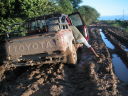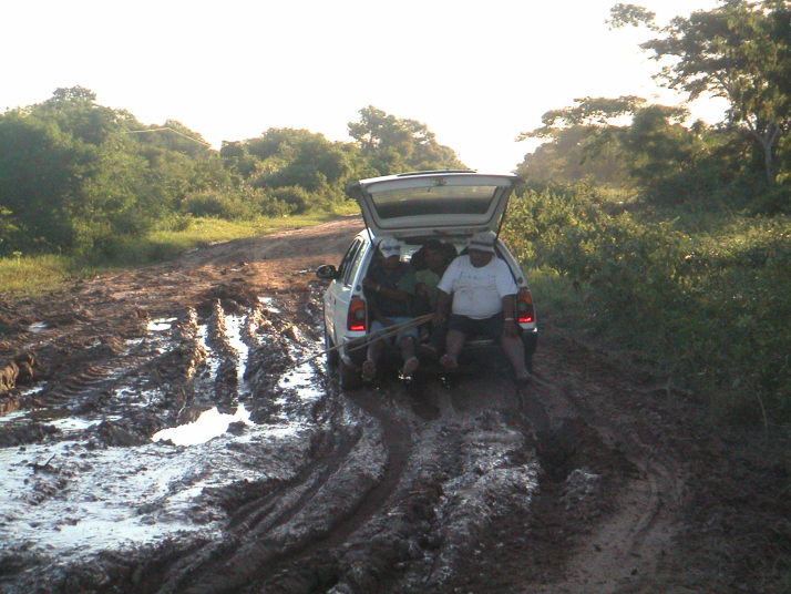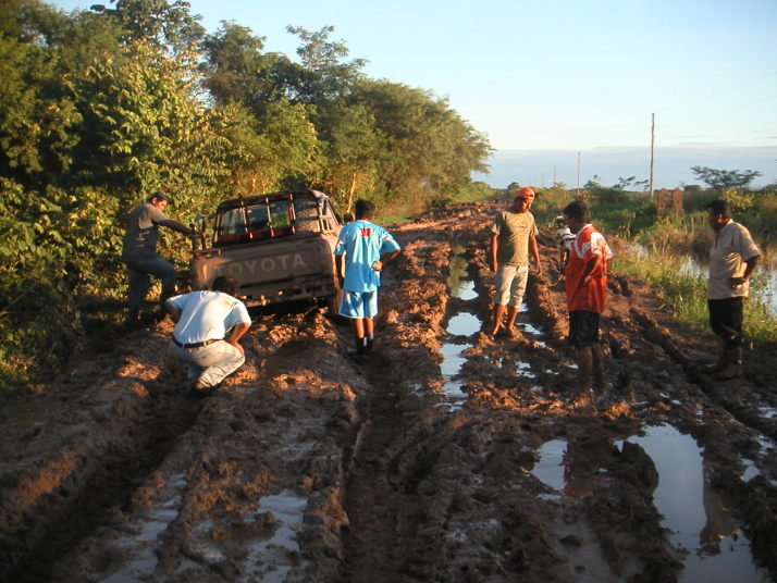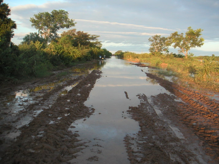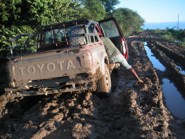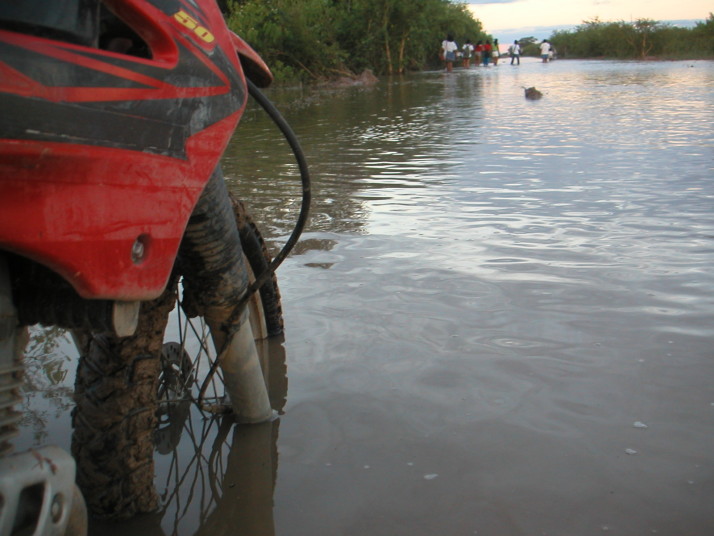 しかし船着場まで残り数kmまで行って夢は崩れた。トヨタの4WDトラックが泥の中でスタックしている。廻りの男たちが押し出そうと泥だらけになって頑張っているがびくともしない。泥水は流れさえあって川が氾濫しているのだと分かる。僕のバイクも泥水の中の深みにはまって身動きが取れなくなった。頑張ればもう少し進めるだろうと思ったがシベリアの経験を思い出して思い留まった。クラッチを労わりながら近くに居た男に押してもらって手前の道路に抜け出した。
